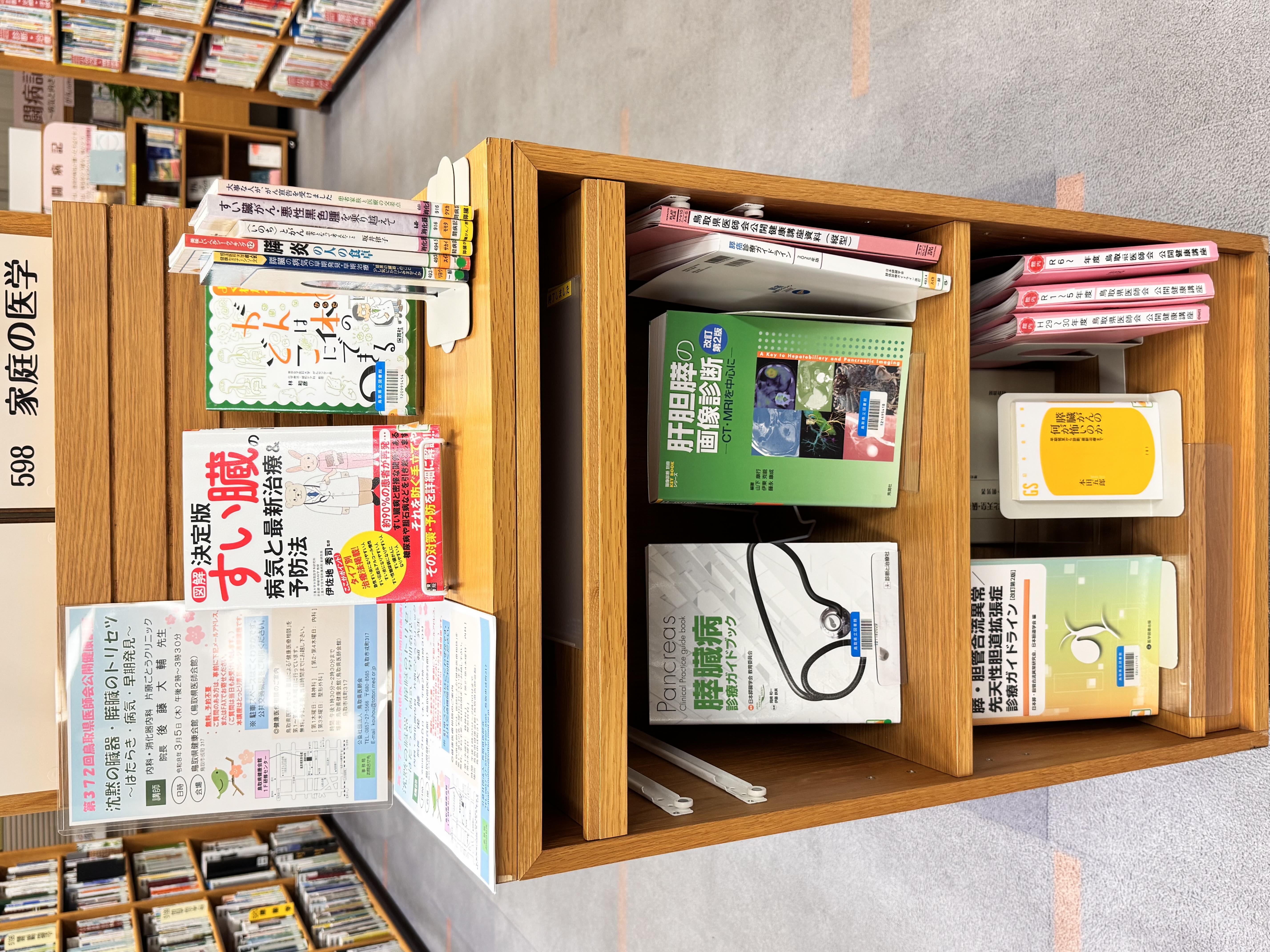 県立図書館では、鳥取県医師会の「公開健康講座」のテーマに合わせた展示を行っています。