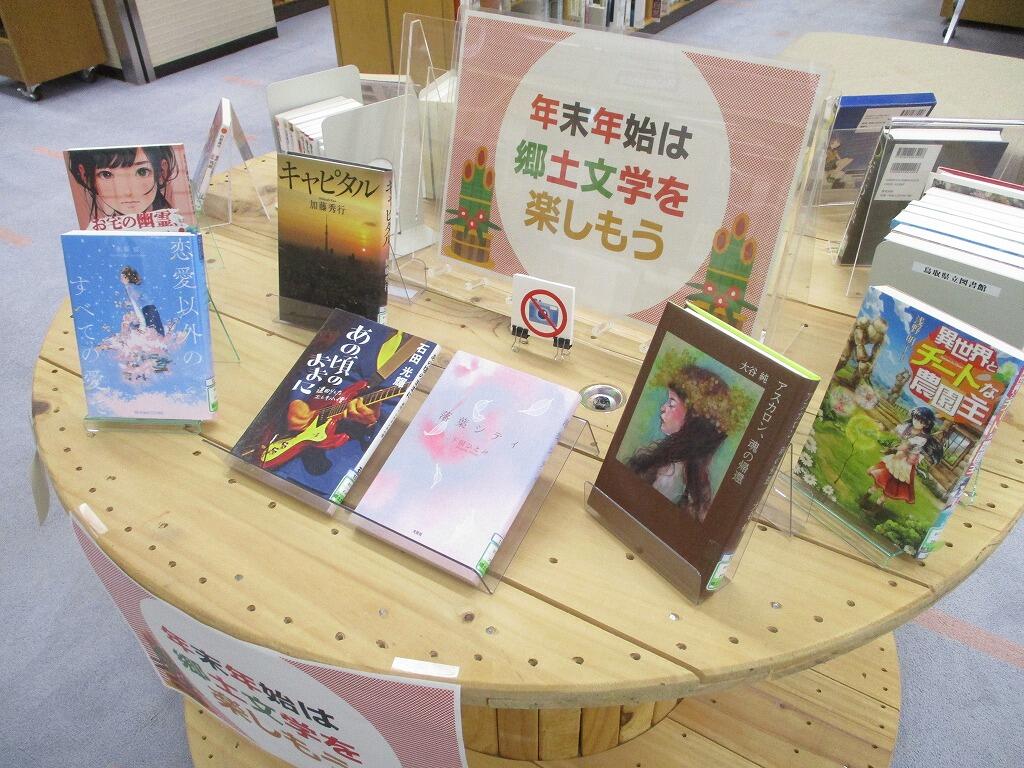 2階郷土資料室にある資料の中から、ふるさと鳥取県出身者(県人)が執筆した文学作品を展示します。展示する作品は主に近年出版された作品で、10代20代のみなさんにも読みやすい内容です。年末年始に郷土文学を手に取って読んでみませんか?ご利用お待ちしています。
