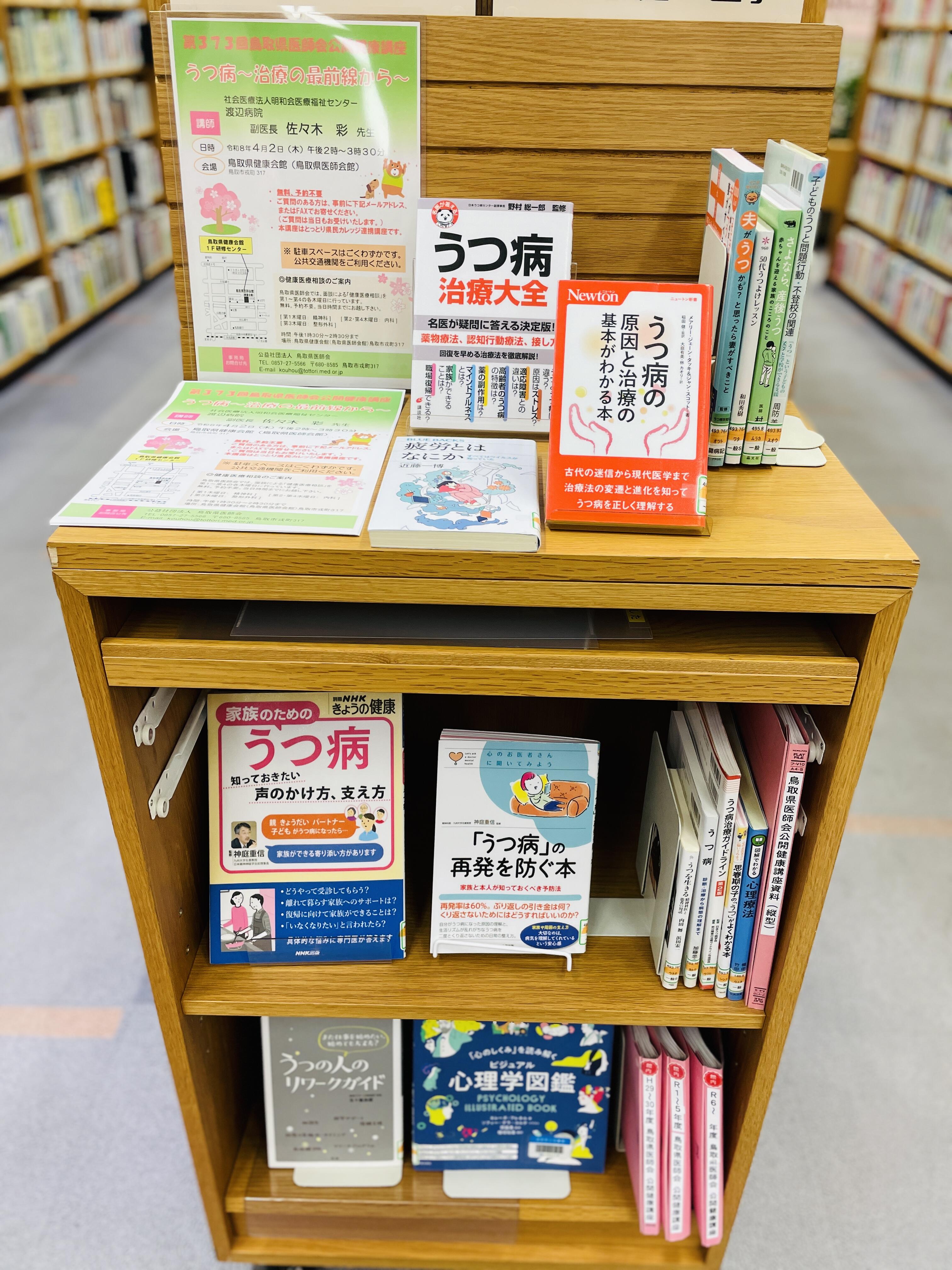 県立図書館では、鳥取県医師会の「公開健康講座」のテーマに合わせた展示を行っています。